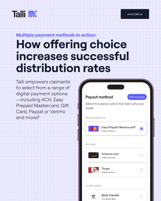 Talli's platform addresses these needs through instant digital payments, a self-service claimant portal, and real-time status updates - changing how claimants experience the settlement process.